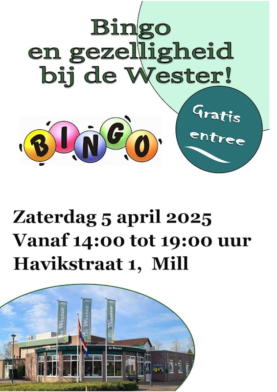 We zijn van plan er een gezellige middag van te maken. Hou je daar ook wel van? Laat ons dan weten dat je erbij bent en we zien je dan op 5 april bij de Wester, Havikstraat 1 in Mill om 14:00. Entree is gratis en de bingo kaarten zijn binnen bij aanvang te koop. Tot dan!