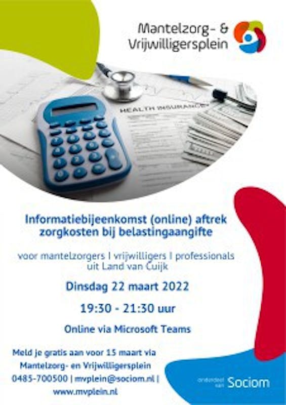 Op dinsdagavond 22 maart 2022 organiseert Mantelzorg- & Vrijwilligersplein (onderdeel van Sociom) een online informatiebijeenkomst over de aftrek van zorgkosten bij belastingaangifte. Als je veel zorgkosten hebt, mag je bepaalde kosten namelijk aftrekken in de aangifte. Het gaat om specifieke zorgkosten die onder bepaalde voorwaarden aftrekbaar zijn. Dit kan zorgen voor financieel voordeel.