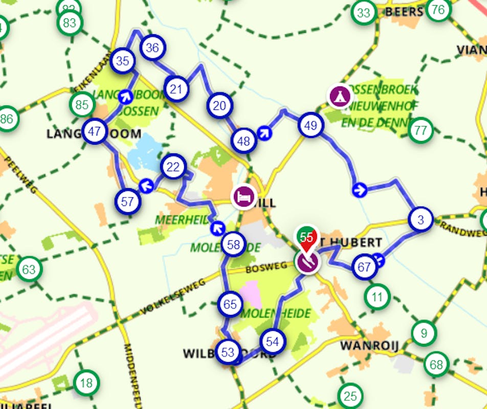 We starten en eindigen de routebeschrijving bij Restaurant Erica in Sint Hubert maar eigenlijk kan je de route op ieder willekeurig knooppunt beginnen. Ook kan je de route naar believen uitbreiden of inkorten, dat is aan jezelf.