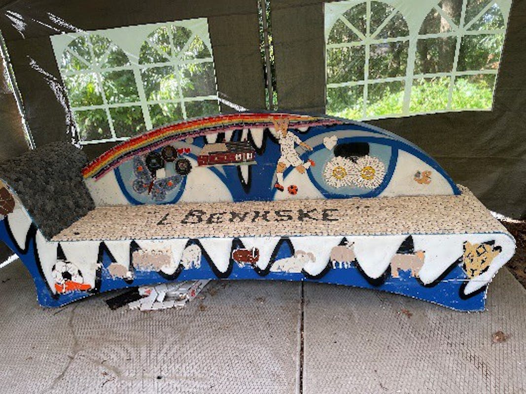 “Dat was een wens van Tiny. Ze wilde graag een bankje op het “Keizerspaadje”, ik heb erover lopen nadenken en heb voor een betonnen bankje gekozen dat in weer en wind kan staan. Het is een gebruikt bankje, dat is mooi dat het al een functie heeft gehad. Met kinderen, kleinkinderen, broers en zussen hebben we op A3 formaat een ontwerp gemaakt van een mozaïek bankje. Wij doen nu niets anders dan tegels kapot slaan en er iets moois van maken. Als het tentje er af is staat het grotendeels in de openbare ruimte. Burgemeester Antoine Walraven heeft via Jos van den Boogaart betonblokken bezorgd om het op te zetten, ja de gemeente staat achter dit initiatief, vindt het mooi”, knikt Peter.